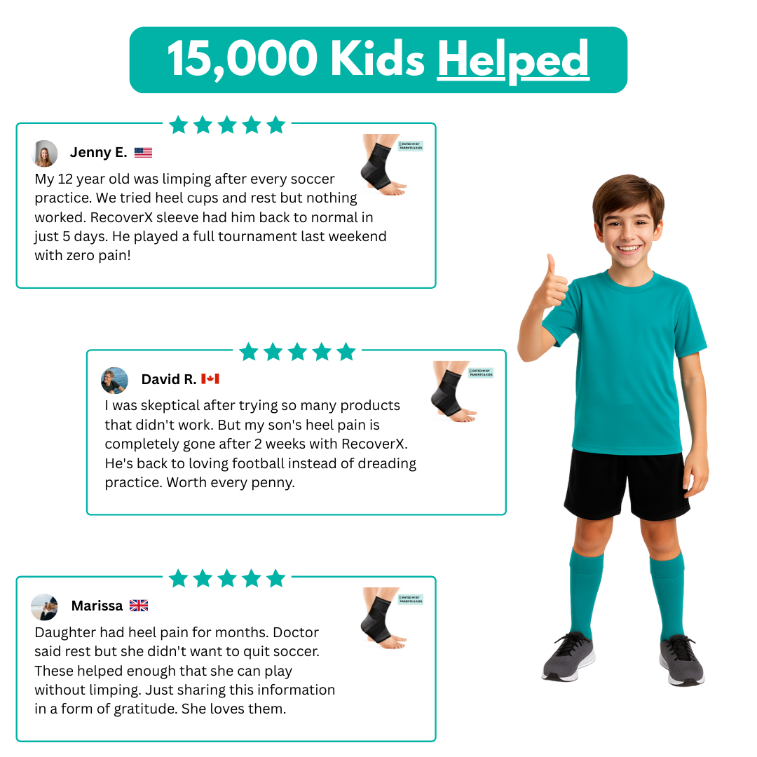 Most products aren't designed for young athletes or Sever's disease specifically. RecoverX uses youth-specific compression levels and targets the exact area where growing athletes experience pain - the heel growth plate. Unlike generic heel cups or adult compression socks, RecoverX allows continued sports participation while providing targeted relief for the unique anatomy of developing feet.